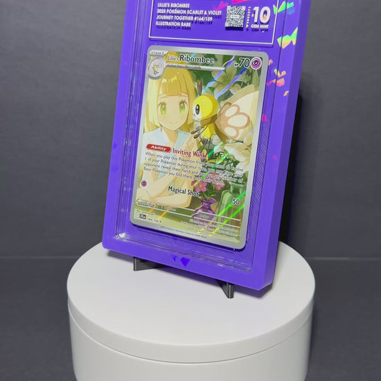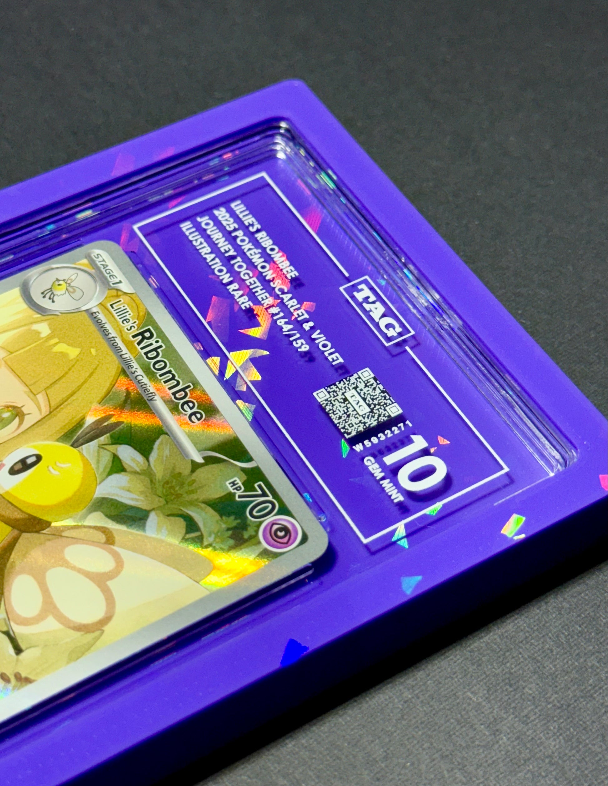 Our Violet Vibe Cracked Ice Refractor Showcase is meticulously designed for TAG graded cards, offering both style and protection. Featuring a brilliant purple color with a unique holo/refracted cracked ice pattern, each Showcase is created with high-quality materials for durability and a precise fit. Perfect for "Showcase"-ing your collection while keeping your slabs safe and secure.