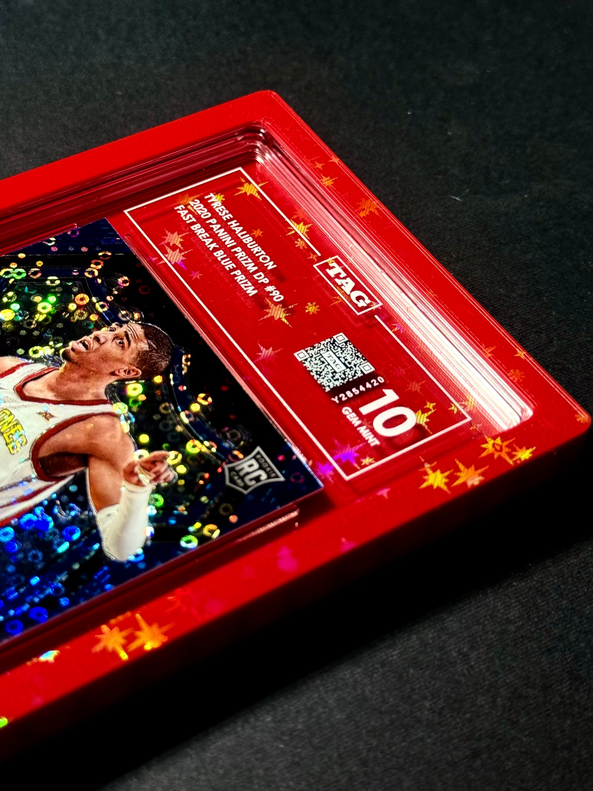 Our Fire Storm Star Refractor Showcase is meticulously designed for TAG graded cards, offering both style and protection. Featuring a vibrant red color with a unique holo/refracted star pattern, each Showcase is created with high-quality materials for durability and a precise fit. Perfect for "Showcase"-ing your collection while keeping your slabs safe and secure.