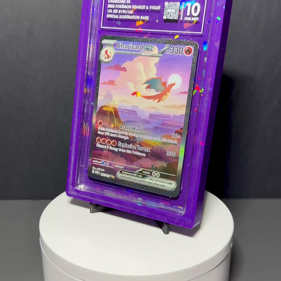 Our Purple Shadow Cracked Ice Refractor Showcase is meticulously designed for TAG graded cards, offering both style and protection. Featuring a dark purple color with a unique holo/refracted cracked ice pattern, each Showcase is created with high-quality materials for durability and a precise fit. Perfect for "Showcase"-ing your collection while keeping your slabs safe and secure.